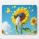 Um girassol vestindo óculos de sol espirrando em um tecido branco com pétalas de flores flutuantes contra um céu azul brilhante