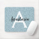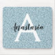 Girly and glam blue silver glitter sparkles monogram name and initial mouse pad. Personalize with your custom name in an elegant black script and your monogram initial in white. You can change the text color and font style and size using the customize option.