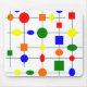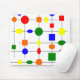 Este mouse pad tem um design Bauhaus de uma grade com formas em vermelho, amarelo, laranja, verde e azul plotadas nele.