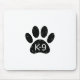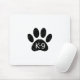 Um texto e impressão de pata de cão com estilo de desenho animado, com efeito de resmungão e ressonância aplicado à imagem. Mouses pads personalizadas com tema K9. Ideia do presente.