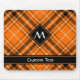 Amostra moderna de tartã laranja e preto de halloween. Texto personalizado e monograma.