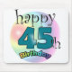 Gelukkige 45ste verjaardag muismat Leuk als cadeau voor iemand die vijfenveertig is geworden. Regenboog kleuren. 45 is in de blauwe kleur.
