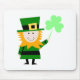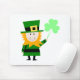 Um pequeno duende feliz está segurando um Shamrock irlandês.
