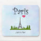 Um mouse personalizado com um desenho caprichoso da Torre Eiffel no fundo cercado por árvores verdes. Um coração cor-de-rosa e a tipografia de Paris adicionam um talento feminino.