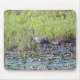 Uma fotografia de um Herão Azul Excelente atravessando um lago. O lago está coberto de lírios de água. A lagoa é confinada por plantas-tronco verdes. Imagem Copyright ©2021 Kimberly J Tilley.