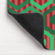 Esse mouse pad tem um design geométrico de hexágonos em quatro tons de verde em um campo de faixas em dois tons de vermelho.