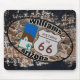 Um tapete do rato legal que ostenta um oval nostálgico da rota 66 da arizona etiqueta-como o design sobre um fundo oxidado preto da fotografia do metal. Williams, arizona, entrada ao Grand Canyon, é uma de muitas cidades ao longo da rota histórica 66 dos E.U. Sabido como a rua principal do americano e da estrada da mãe, a rota 66 dos E.U. era uma das estradas originais dos E.U. A estrada conectou Chicago a Los Angeles através de oito estados (incluindo Illinois e Califórnia).