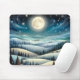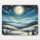 Uma paisagem serena de inverno se desdobra sob o brilho de uma lua de cheio, com colinas rolantes cobertas de neve e pontilhadas com árvores escuras e verdes. Estrelas brilham no céu noturno profundo, acrescentando um toque mágico à cena pacífica. Esta paisagem de fantasia apresenta uma lua de cheio iluminando um campo coberto de neve no inverno, com colinas, árvores e um céu estrelado.