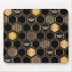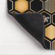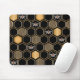 Este design contemporâneo apresenta um padrão geométrico de coloração dourada das colmeias, mamangabas e um fundo preto.