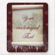 Ilustração de pergaminho de inverno com um antigo pergaminho de papel com uma paisagem nevada e decorada com neve e ícones em fundo vermelho escuro com flocos de neve.