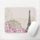 O impressão da torre Eiffel apresenta flores cor-de-rosa bonito em um lugar branco, com um desenho da torre Eiffel sobre uma rosa claro lavada com um selo postal de 1921