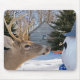 Buck branco indo pelo nariz de cenoura de um boneco de neve.