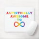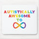 Design feito com amor pela Consciência Autista. As letras arco-íris formam a frase "Autisticamente Infinito" com um símbolo infinito.