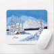 Um mousepad com uma bela cena de inverno, incluindo montanhas nevadas, cabana rústica e pinheiros cobertos de neve. A imagem e o texto podem ser personalizados. Arte original de W.B.