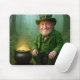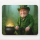 A happy leprechaun in a traditional green suit and hat sits in a vibrant forest next to a pot brimming with glowing golden coins