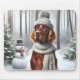 Um cachorro vestindo uma cinza de chapéu e cachecol se posiciona em uma floresta de neve ao lado de um boneco de neve