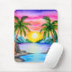 Escape to a glowing shoreline with this Island Tropical Beach Sunset design. Two palm trees frame a calm lagoon and distant mountains as the sun sinks into the water, flooding the sky with rich pink, orange, and golden light that melts into cool turquoise and violet hues. Bold, saturated color and soft gradients give the artwork a dreamy vacation-poster feel, capturing the relaxed warmth of an evening on a quiet island coast.