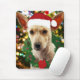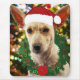 Uma pintura digital de um filhote pronto para o Natal com uma coroa, chapéu de Papai Noel e uma árvore decorada.