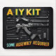 Uma imagem de alta resolução visualmente impressionante mostrando um AK-47 desmontado contra um fundo preto elegante. Os componentes da arma estão meticulosamente arranjados, enfatizando seus detalhes complexos. O texto ousado, mas humorístico, "Kit de repouso: alguma montagem necessária", acrescenta um toque lúdico à estética técnica, fazer a imagem tanto engajadora quanto divertida. Perfeito para entusiastas que apreciam a interseção entre a engenharia de precisão e o humor!