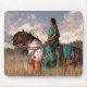 Uma mulher indiana americana monta um dun e branco manchou o cavalo do mustang através de um campo da grama alta. Fora na distância uma floresta dos abeto alinha a pastagem. Atrás da floresta, sharp, elevação rochosa, coberto de neve dos picos alta no céu onde tração de nuvens cor-de-rosa wispy preguiçosa perto. Um vento delicado funde pegarando a juba preta e a cauda do cavalo. Suas sela e vestidura são ambas preto com franjas de turquesa. O símbolo repetitivo de Kokopelli, o espírito da fertilidade, enche os espaços abertos do material. Kokopelli é uma deidade da fertilidade das culturas indianas americanas do sudoeste. Theorised que está baseado em um tipo real de pessoa, em um tipo do comerciante de viagem, no contador de histórias, no repórter, e no anfitrião. Você pôde dizer que é o nativo americano equivalente a um bardo, a um trovador, ou a um minstral europeu. Geralmente, é descrito apenas, mas em algumas capitulações, tem um associado ou uma esposa conhecido como Kokopelmana ou Kokopelli-mana. Aqui eu descrevi-a como uma pessoa real, um caixa de história de viagem que monta um cavalo com o oeste selvagem americano.