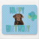 Uma bela foto do cão Labrador Retriever desejando "Feliz Aniversário" e balões e bolinhas azuis de fundo adiciona cores a este belo Mousepad