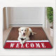 Cachorro loiro Labrador Retriever em um tapete vermelho e marrom com texto de boas vindas por uma porta branca.