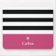 Um moderno e largo padrão de faixas horizontais mousepad em preto e branco e com um sotaque cor-de-rosa profundo. Personalize adicionando seu nome abaixo do logotipo da margarida retrô-quic.