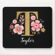 Uma bela e feminina pastilha floral cor-de-rosa, revestida de flores cor-de-rosa e de uma letra T, "faux gold monograma", num fundo preto. Personalize o mouse pad adicionando seu nome abaixo do monograma. Faz um presente divertido para um amigo ou para uma dama de damas de honra. Projetado para você pelo Blackberry Boulevard.
