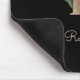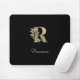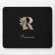 O mouse preto elegante apresenta um monograma botânico dourado no centro.