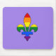 Design com símbolo fleur-de-lis (fleur-de-lys ou flor de lírio) com faixas do arco-íris a partir da bandeira LGBT (lésbica, gay, bissexual e pessoas transgênero), orgulho gay design em fundo roxo