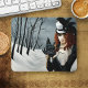 Mulher vitoriana de cabelos vermelhos no steampunk em um passeio de inverno para soltar sua libélula mensageira com uma chave.