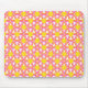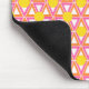 Este mouse pad tem um design geométrico de triângulos cor-de-rosa e laranja repetidos com círculos amarelos em cima, num campo de esbranquiçado. Quer o mesmo design em cores diferentes? Me mande mensagem.