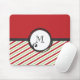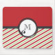 Um mouse personalizado com a metade inferior coberto por um padrão vermelho verde e diagonal listrado. Remédio de canas doces de Natal aromatizadas com hortelã-pimenta. A metade superior da design é um vermelho festivo. No centro há um círculo bonito em estilo branco desenhado à mão com um monograma no centro.