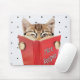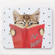 Tabby cat com óculos lendo livro vermelho sobre fundo de bolinhas. O padrão de fundo pode ser alterado.