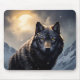 Um lobo preto majestoso com olhos amarelos piercing se coloca em um pico de montanha de neve, mirando intensamente no observador. O pelo do lobo é grosso e escuro, contrastando fortemente com a neve branca e a lua amarela brilhante no fundo. A cena é banhada em uma luz suave e etérea, criando uma sensação de mistério e maravilha. Presente perfeito para lobos e amantes da vida selvagem.