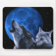 Dois lobos que urram no o céu nocturno, com uma lua azul grande que pendura baixo.