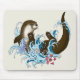 Uma lontra marrom fofa brincando na água com flores em um fundo de cor creme
