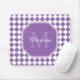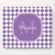 Faça um respingo com esta luz na moda - diamante geométrico roxo e branco mousepad verificado do monograma do teste padrão do azulejo. Personalize este design à moda adicionando sua inicial conhecida e monogrammed.