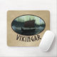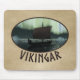 Uma imagem ligeiramente estilizada de um navio de longa distância Viking navegando à noite sob as Luzes do Norte ali um casal de icebergs; a maioria da tripulação está dormindo. A leitura de texto "VIKINGAR" (Vikings) também é exibida. Esta é uma versão desbotada ou vintage da imagem original mais clara que também está disponível.