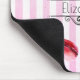 Mousepad personalizado com um rico de aquarela design de macarões franceses doces e deliciosos em formação circular. No centro está uma moldura decorativa que guarda seu nome. O texto pode ser personalizado com seu nome, nome comercial ou o que você quiser. Os macarões são pintados em muitas cores bonitas como rosa, azul, verde limão, amarelo ensolarado, vermelho, roxo etc.. Colocado sobre um padrão riscado rosa angustiado. Chic e clássico.
