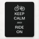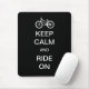 As características deste design do divertimento uma silhueta branca da bicicleta em um fundo preto com o texto "mantêm a calma e montam-na em" no branco.