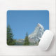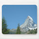 O Matterhorn (Suiça) é uma imagem de montanha icônica. A montanha encontra-se na cadeia montanhosa dos Alpes, na Europa. Esta famosa imagem de montanha é vista aqui contra um céu azul de meio-verão, com a lua no canto superior esquerdo e pinheiros no primeiro plano.