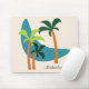 O texto personalizado do nome é apresentado neste mouse pad que tem uma vibração retroativa junto com um desenho influenciado pelo Meio século de gráficos minimalistas da palmeira em laranja e verde ao redor de um oásis em forma de bumerangue ou piscina de natação em um azul-aqua vívido. A cor de fundo da areia pode ser editada.
