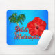 Mele Kalikimaka é havaiano para o Feliz Natal. Comemore um Natal morno agradável da praia. Mele Kalikimaka decorado com enfeites de natal e bastões de doces. Um Natal decorou a palmeira e um hibiscus vermelho do feriado floresce.
