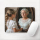 Uma jovem está em frente a um espelho de ornamentado, olhando para o reflexo de uma mulher idosa