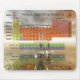 Uma versão artística da mesa periódica com produtos vidreiros científicos e reflexões.