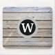 Mouse pad de monograma com aparência de madeira de pinheiro desgastada. Você vai adorar este visual rústico, mas moderno e aconchegante! Letra de monograma branca em círculos pretos e cinzas e um fundo de ripas de madeira de pinheiro desgastada.