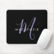 Placa do mouse Elegante Modern Black Lavanda Script Monograma. Um monograma elegante de script de Lavanda combinado com uma fonte branca san-serif limpa permite uma aparência contemporânea.