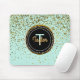 Adicione alguma elegância e bling a seu espaço de escritórios com um verde e um ouro pálidos da hortelã, ao verde macio bonito da hortelã do mousepad- monogrammed e à cor do ouro combinados. O centro tem o preto e o círculo do metal do ouro do falso com nome personalizado no roteiro de harmonização da matiz do ouro e na cor pastel da hortelã, letra inicial monogrammed. Os pontos glam dos confetes da folha de ouro do falso são dispersados transversalmente. Nota: Todas as imagens são imprimidas. Brilho nao real do metal ou dos confetes. Dê um presente personalizado para ela que será usada não somente, mas apreciado. Presente sofisticado, personalizado para as fêmeas executivas ou para a decoração feminino à moda do escritório domiciliário.