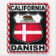 Mosto Americano da Califórnia. Design da Califórnia dinamarquesa, ao estilo de uma placa de rota legal americana. O texto California Danish está ao longo do topo e do fundo, com a bandeira do Estado da Califórnia e a bandeira da Dinamarca a dentro da placa de rota. Excelente para os californianos de ascendência dinamarquesa, e para ex-pais na República da Califórnia!